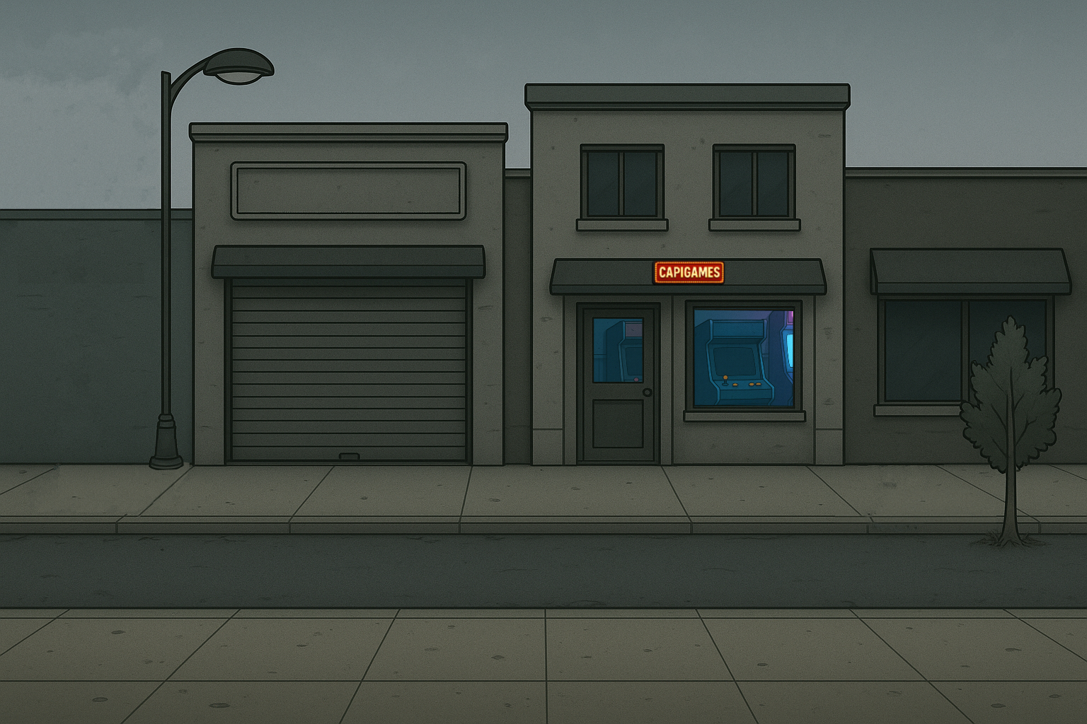 Ao sair de casa, visualiza as ruas abandonadas, sujas, lojas fechadas... aquela cidade sem cor, sem vida, sem nada. Ao final da rua, o Capigames é a única coisa viva naquele lugar.